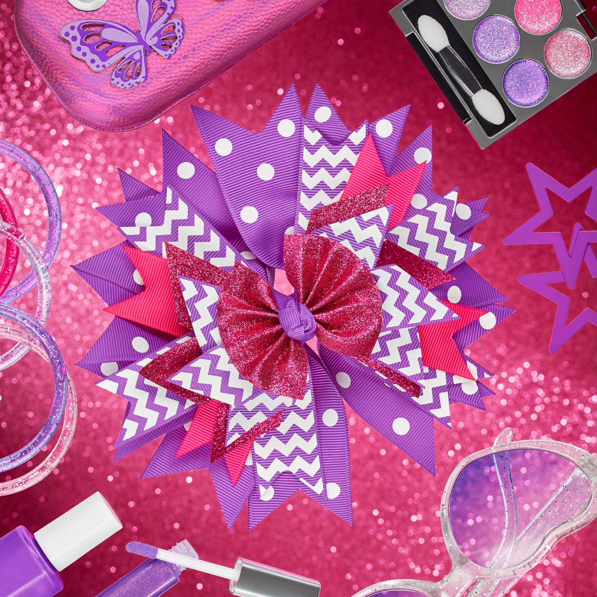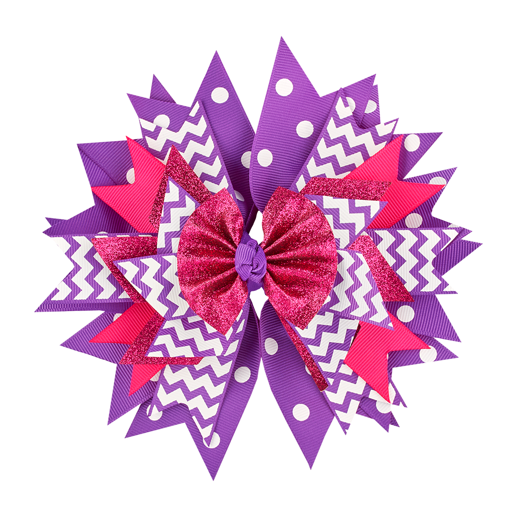 Be the belle of the ball and the classroom in Lily Frilly's pink and purple bow! Polka dot, chevron print and glittery, layered fabric will come with flare and lots of attention! It includes a large clip that grips even the thickest of hair.